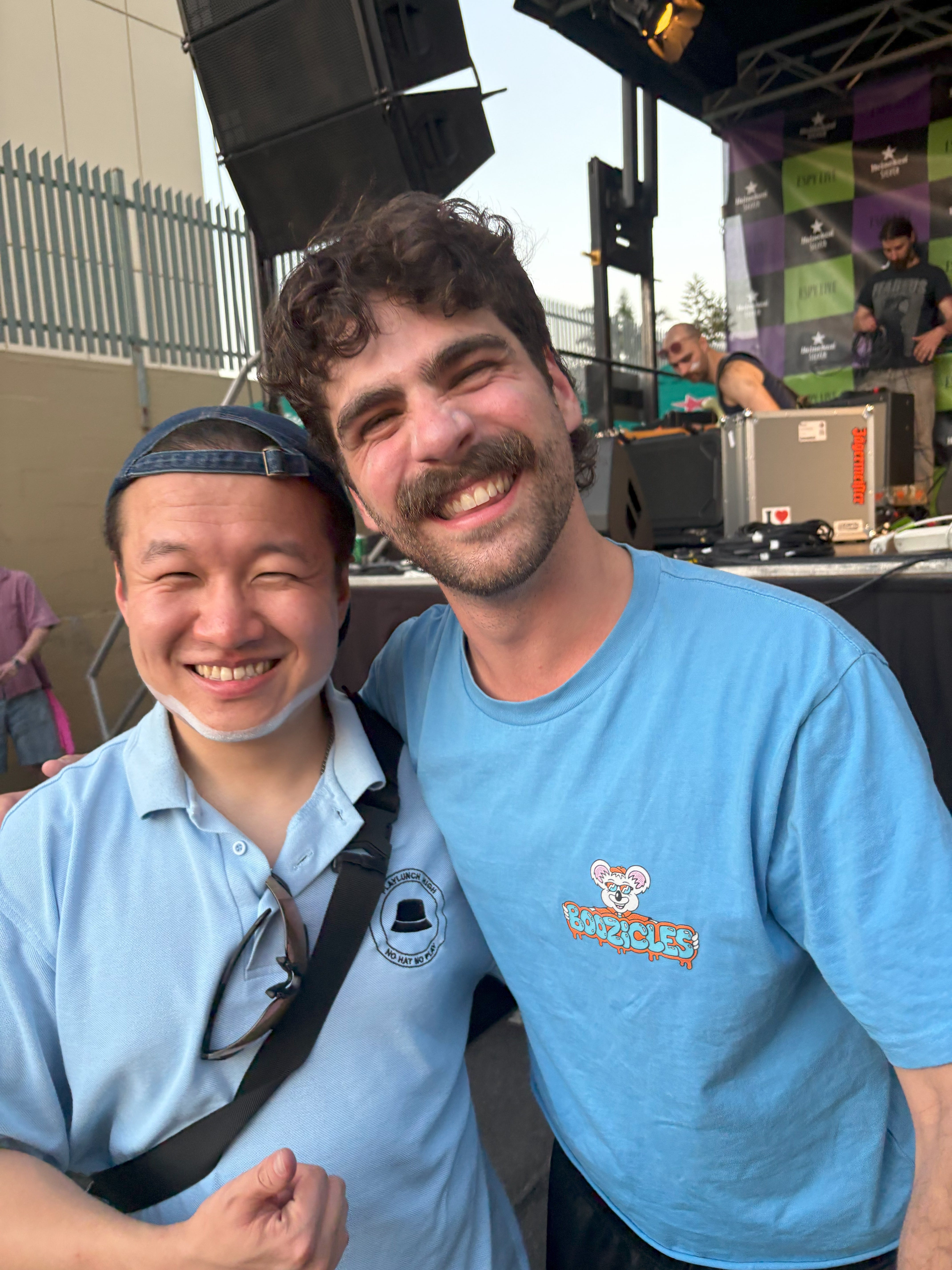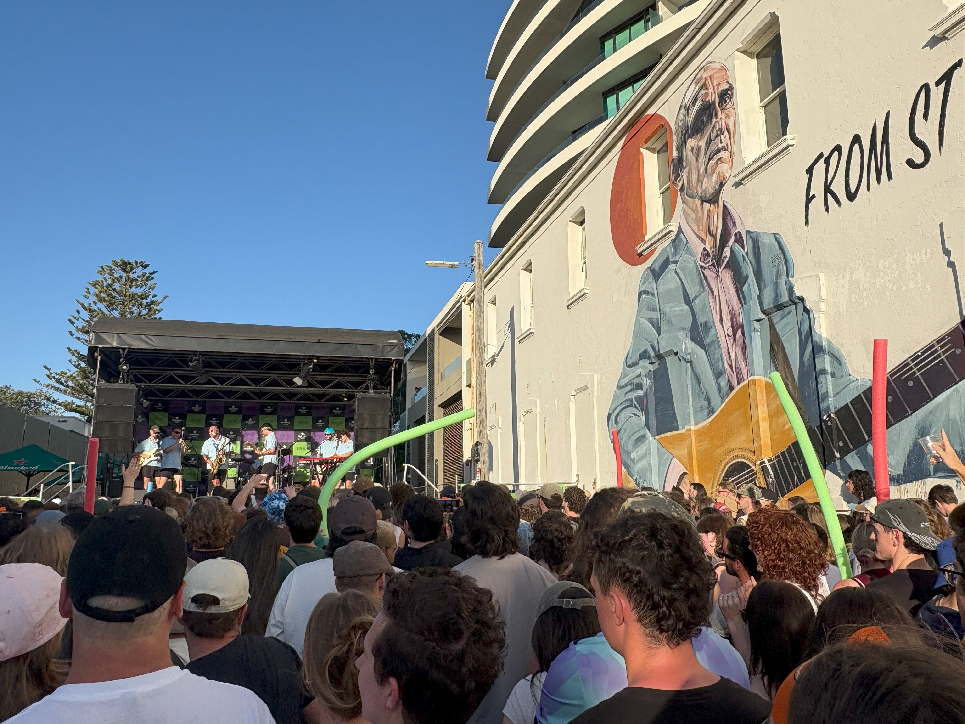We meet Francis Leach at the security point outside the Espy, and the stage is set up in the laneway beside the pub, next to the ‘FROM ST KILDA … ‘ Paul Kelly mural.