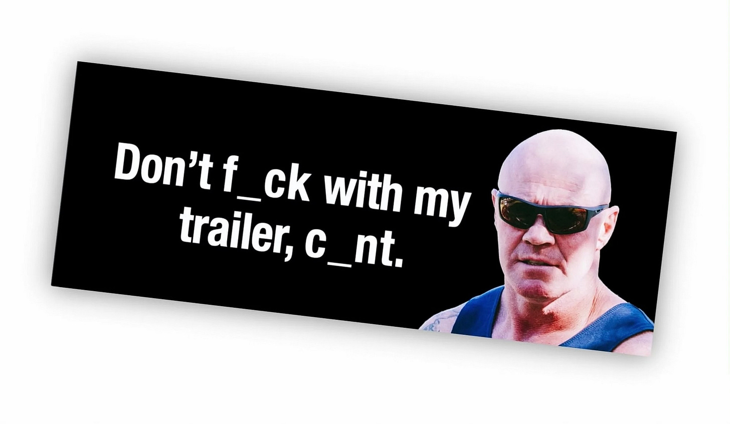 ‘Don’t fuck with my trailer —’ Jack says, leaving off the last word.