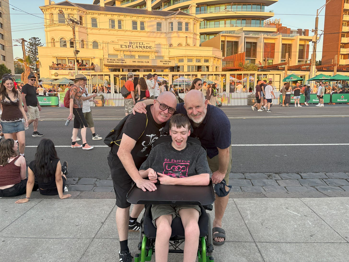 We park 1.4 kilometres from the Espy, and begin our walk down a closed-to-vehicles Beaconsfield Parade. A few years ago, Jack would have been shrieking at this point of the buildup (see a piece I wrote about the Rockwiz Good Friday show) but now he just nervously stims with fingers drumming palms and asks that we keep moving until the gig starts.
