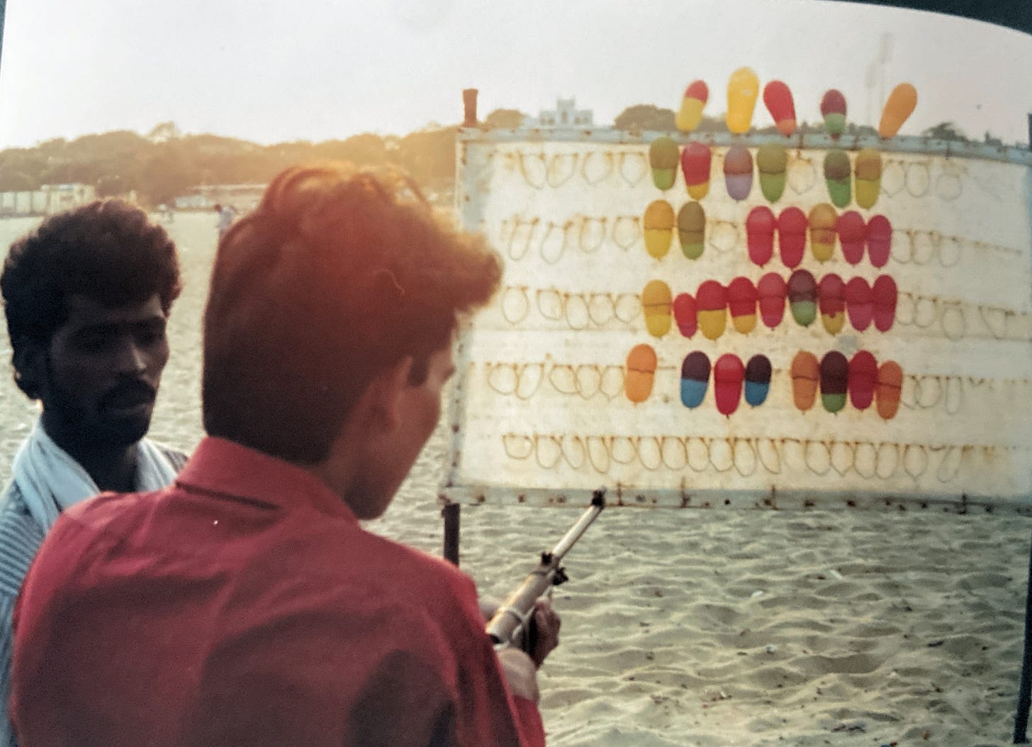 For a moment, I had no idea what he was talking about, but was then relieved to see he was pointing to a masonite board a few stalls along - neatly adorned with dancing, multicolored balloons. In front of the board, a father was using one hand to direct a pellet gun in their general direction while, with the other, he was helping his two-year-old daughter with the vagaries of the trigger.