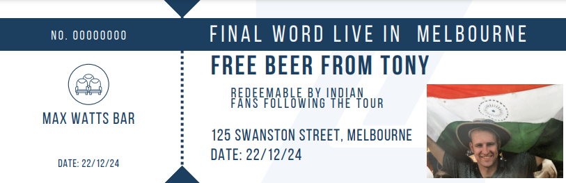 . They’ve got live shows all around the country, and I’ll be in the audience at Max Watts for the live show in Melbourne on 22nd December.If you see me at that event, and you’re an Indian who has travelled to Australia to follow this tour, come up to me on the 22nd, present this ticket, and I’ll buy you a beer! That’ll be a thank you for how Indians treated me in 2001. What a life highlight.