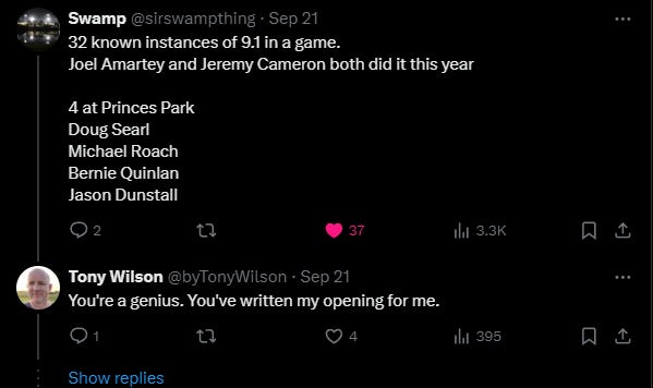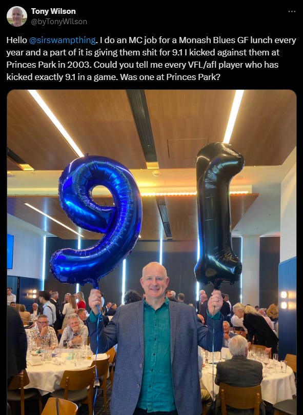 I started investigating who else in the history of the game had kicked exactly 9.1. The person to ask for niche AFL statistics is the legendary @SoirSwampthing on the site formerly known as Twitter. Swampthing did what Swampthing does: